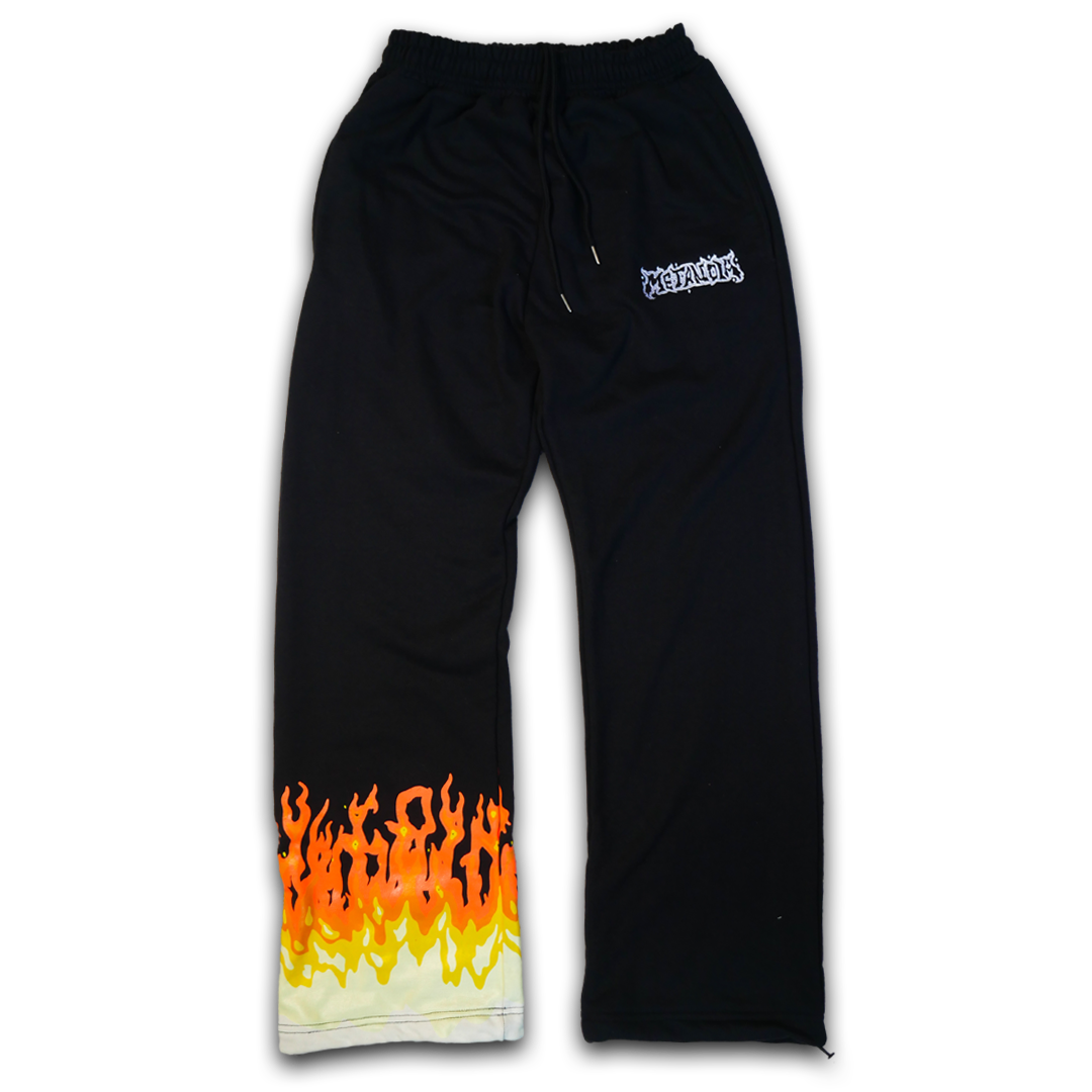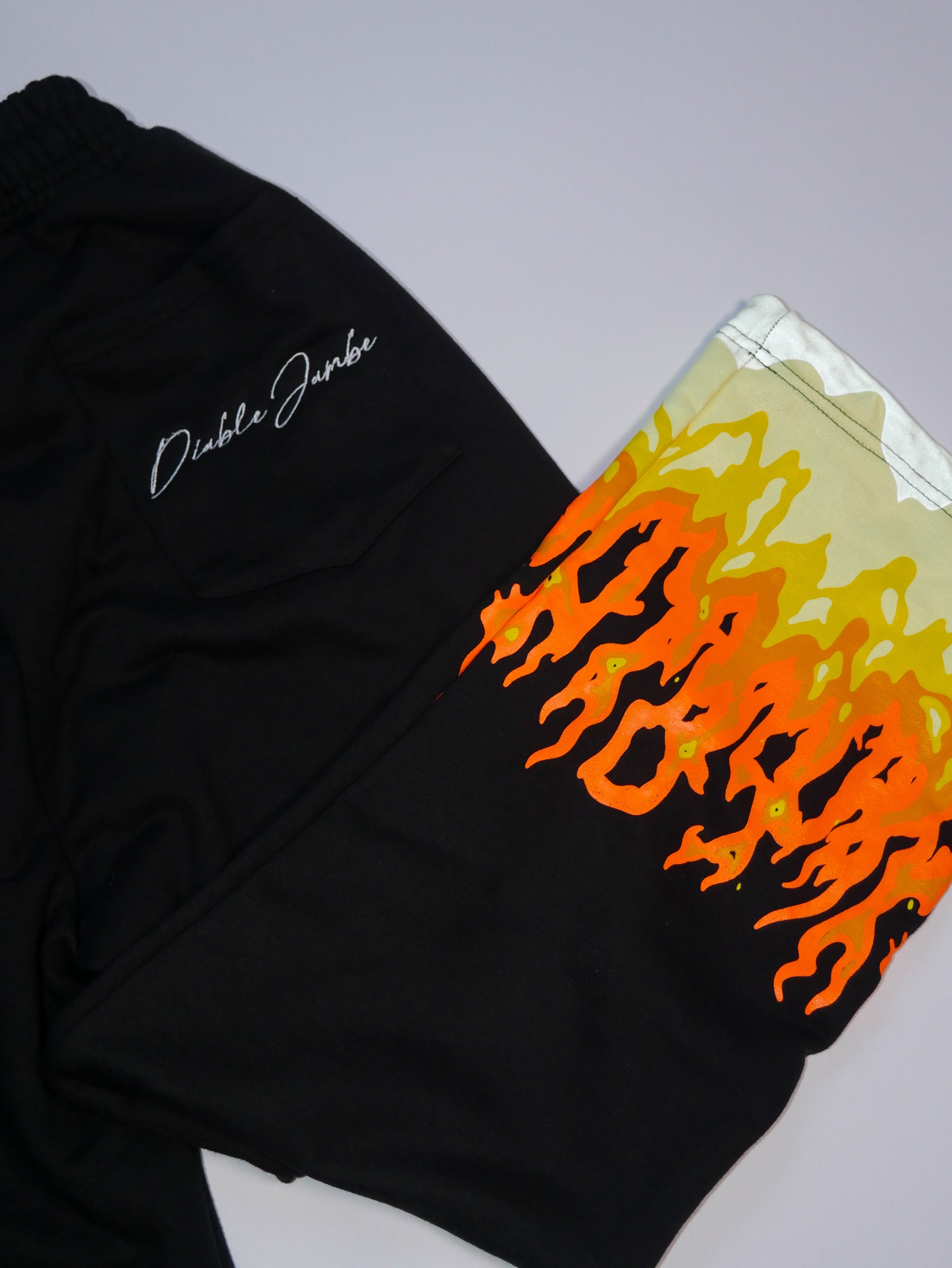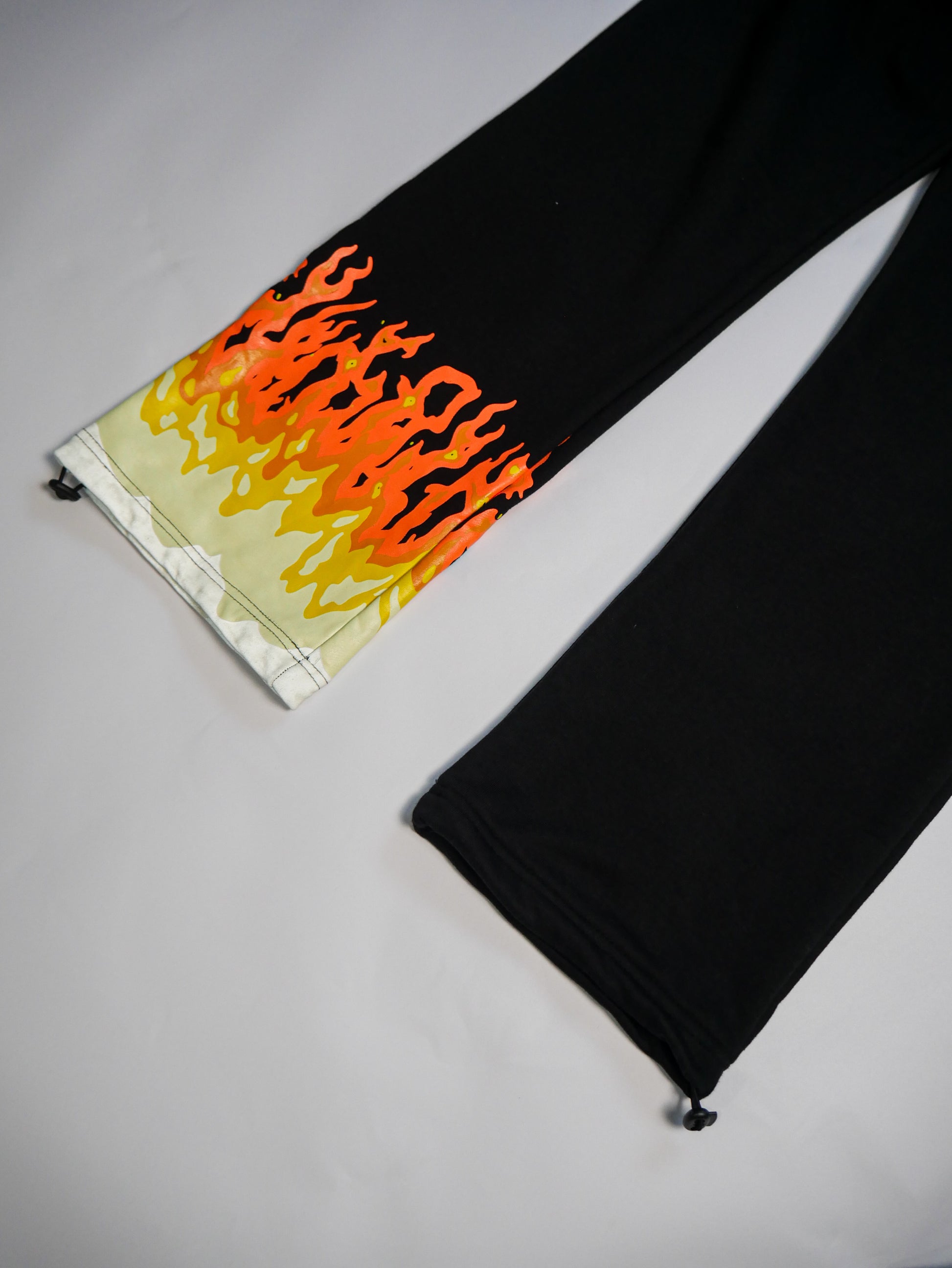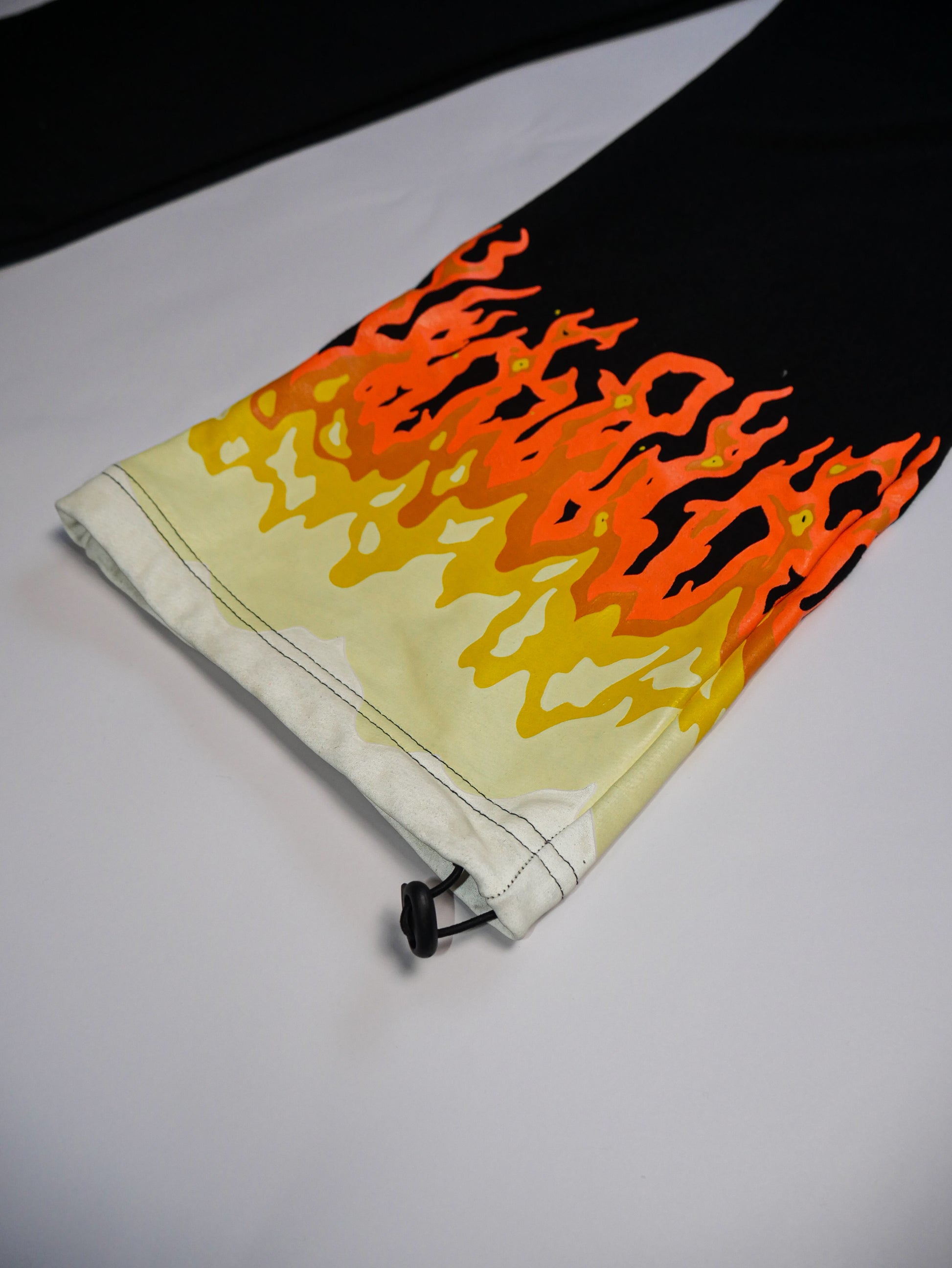 - Fiery orange-to-yellow flame embroidery at the hem—bold gradient flames that POP against the sleek black base